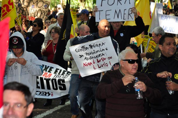 Assim como em todo o Brasil, Santa Cruz do Sul parou durante a manhã neste dia 28 de abril com a Greve Geral convocada por centrais sindicais contra as reformas previdenciária e trabalhista. A paralisação atingiu instituições de ensino, agências bancárias e setores públicos e teve o apoio de entidades que representam professores das redes municipal, estadual e privada, além da Associação dos Docentes da Unisc (Adunisc). De acordo com a Brigada Militar participaram da caminhada cerca de 4,5 mil manifestantes. O movimento liderado por centrais sindicais iniciou às 5h30 com protesto em frente à Xalingo Brinquedos e seguiu pelo bairro Arroio Grande em direção às ruas centrais da cidade. Às 9h30 houve grande concentração na Praça Getúlio Vargas, após seguiram até a Praça da Bandeira com gritos e cartazes de “Fora, Temer”, “Nenhum direito a menos”, “Reforma da Previdência: tudo para o governo, nada para o cidadão”. E finalizaram os atos em frente à sede do Instituto Nacional do Seguro Social (INSS). O comércio manteve as portas fechadas enquanto os grevistas passavam, mas depois abriram normalmente.