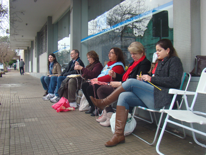 Os grevistas ficam durante o turno da manhã em frente à sede do INSS de Santa Cruz do Sul, e enquanto não chegam a um acordo, alguns servidores estão fazendo blusões, cachecóis e toucas de crochê para doar a Copame.