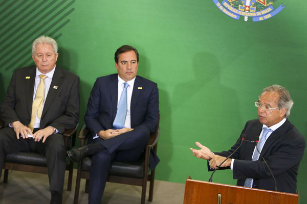 Ao empossar nesta segunda-feira, 7, no Palácio do Planalto, os novos presidentes do Banco Brasil, Rubem Novaes, do Banco Nacional de Desenvolvimento Econômico e Social (BNDES), Joaquim Levy, e da Caixa Econômica Federal, Pedro Guimarães, o ministro da Economia, Paulo Guedes, afirmou que a tarefa dos novos dirigentes será “fazer a coisa funcionar direito” e eliminar associações “perversas” como ocorreram nos últimos anos.