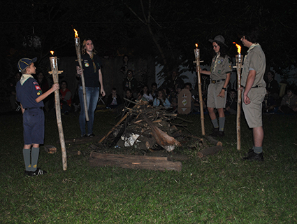 Na noite de comemoração, jovens escoteiros contaram a história do Escotismo na cerimônia “Fogo de Conselho”