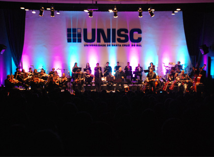 Nem mesmo a forte chuva que caía em Santa Cruz do Sul no último domingo, 14 de julho, foi capaz de afastar o público que lotou o auditório central da Universidade de Santa Cruz do Sul (Unisc) para conferir a reunião da Orquestra da Unisc, regida pelo professor Leandro Schaefer, com músicos da cidade. Juntos eles tocaram clássicos do rock, em homenagem ao estilo que teve seu dia celebrado no último sábado, 13 de julho.