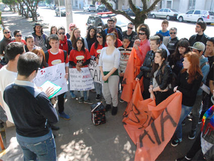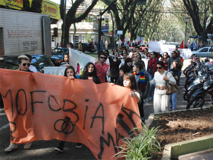 Com faixas e entoando gritos contra homofobia, um grupo de aproximadamente 70 pessoas foi às ruas no sábado, 30, protestando contra atos de violência e discriminação à comunidade de Lésbicas, Gays, Bissexuais, e Transgêneros (LGBTs). O ato iniciou na Praça Getúlio Vargas, às 9 horas, quando os manifestantes se reuniram e definiram o trajeto da caminhada. Por volta das 10h, o grupo saiu pela Rua Marechal Floriano até a frente do Palacinho, sede do Governo Municipal, onde foi lida uma carta com diversas reivindicações que está sendo entregue ao Poder Público local. Após, a caminhada continuou até a frente da Câmara de Vereadores e depois se deslocou até a Delegacia da Polícia Civil. Por fim, o ato encerrou em frente à sede do Ministério Público.
