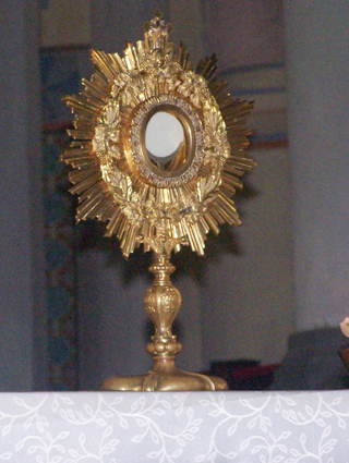 fiéis a rezarem diante de Jesus presente no Santíssimo Sacramento (no detalhe)
