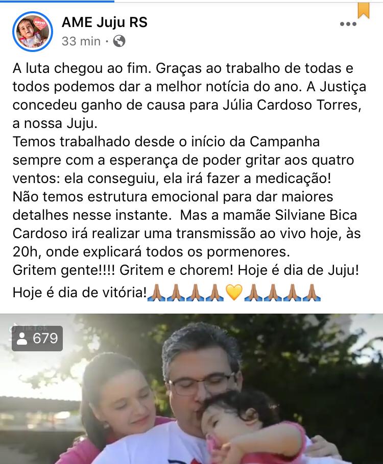 Em publicação na rede social oficial da campanha Ame Juju RS no Facebook na tarde desta terça-feira, 30, a mãe da pequena Júlia Cardos Torres comemora que a Justiça concedeu ganho de causa para a Juju, que irá poder dar início ao tratamento com o medicamento Zolgensma. Na publicação, a mãe Silviane Bica Cardoso diz estar muito emocionada e que mais detalhes serão divulgados em uma live hoje à noite, às 20 horas, na página do Facebook Ame Juju RS.