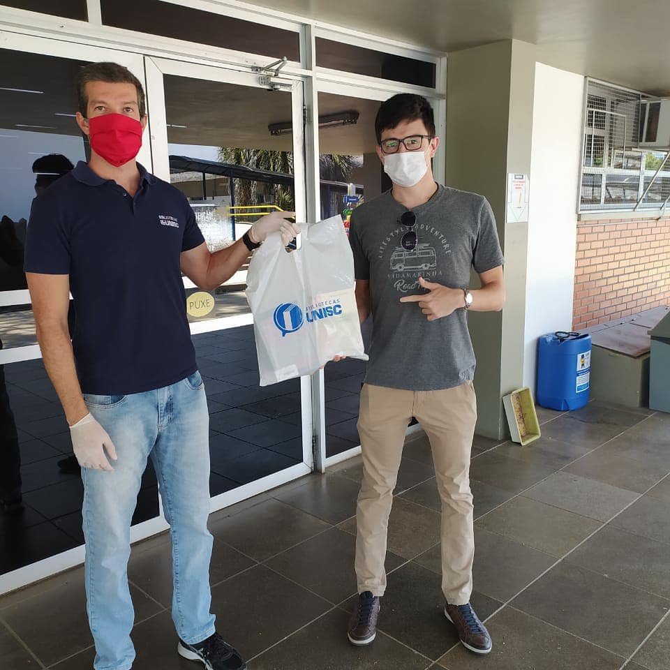 Ao retirar o material, o aluno pode aguardar no estacionamento da Unisc se estiver de carro ou ir diretamente na porta da biblioteca se estiver a pé. A entrega é efetuada por um funcionário, que estará utilizando máscara e luvas, com os livros armazenados em uma sacola.
