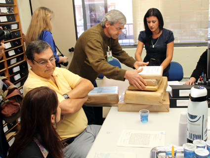 A presidente da Comissão de Licitação empacota as propostas para lacrar. À esquerda, a indignação do engenheiro Finamor, da Corsan, que queria reaver o envelope da estatal