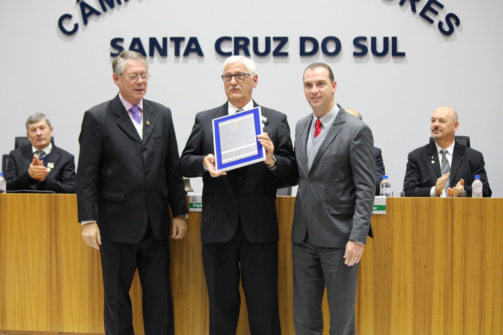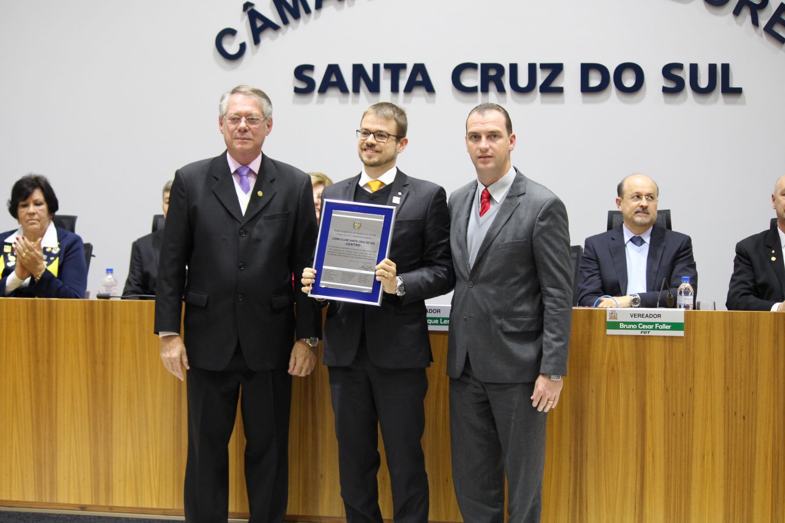 Em nome do Lions Clube Internacional, Edisson Karnopp, lembrou da trajetória do Lions Clube Internacional, das atividades realizadas e também da atuação em Santa Cruz do Sul. Edisson entregou uma homenagem do Lions Clube Internacional ao presidente do Poder Legislativo, Paulo Henrique Lersch (PT) e ao vereador proponente, Edmar Hermany (PP).