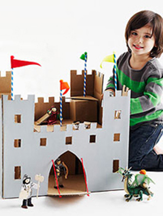 Pegue a caixa de papelão lisa e corte as abas superiores. Para cortar as torres nos cantos, desenhe um retângulo de 15 x 27cm na parte de cima de cada lado e corte usando um estilete; crie as bordas do muro do castelo, fazendo entalhes de 2,5 x 2,5 cm na parte superior da caixa com auxílio do estilete e da placa de corte; desenhe uma porta levadiça de 18 cm de altura (como mostrado na figura) e recorte até o fundo, que ainda está ligado à caixa. A seguir, utilize um lápis para marcar os dois orifícios correspondentes de cada lado da porta, onde ficarão presas as “correntes” que a fazem subir e descer; recorte quadrados de 3 cm para fazer as janelas usando o estilete e a placa de corte. Feche bem a caixa embaixo e cole com cola quente. Pinte o lado de fora com duas demãos de tinta cinza e deixe secar. Coloque caixas menores no interior do castelo para criar altura e corredores para os bonequinhos; corte duas cordinhas de 15 cm de comprimento e passe através dos furos correspondentes na porta e moldura. Dê um nó para prender; para fazer bandeiras, insira uma haste de chenile em um canudo e cole um pompom para finalizar. A seguir, corte uma bandeira triangular de feltro e cole pelo lado mais largo no topo da haste. Anexe as bandeiras na caixa, empurrando o chenile através da caixa e adicione cavaleiros e cavalos de brinquedo na hora de brincar.