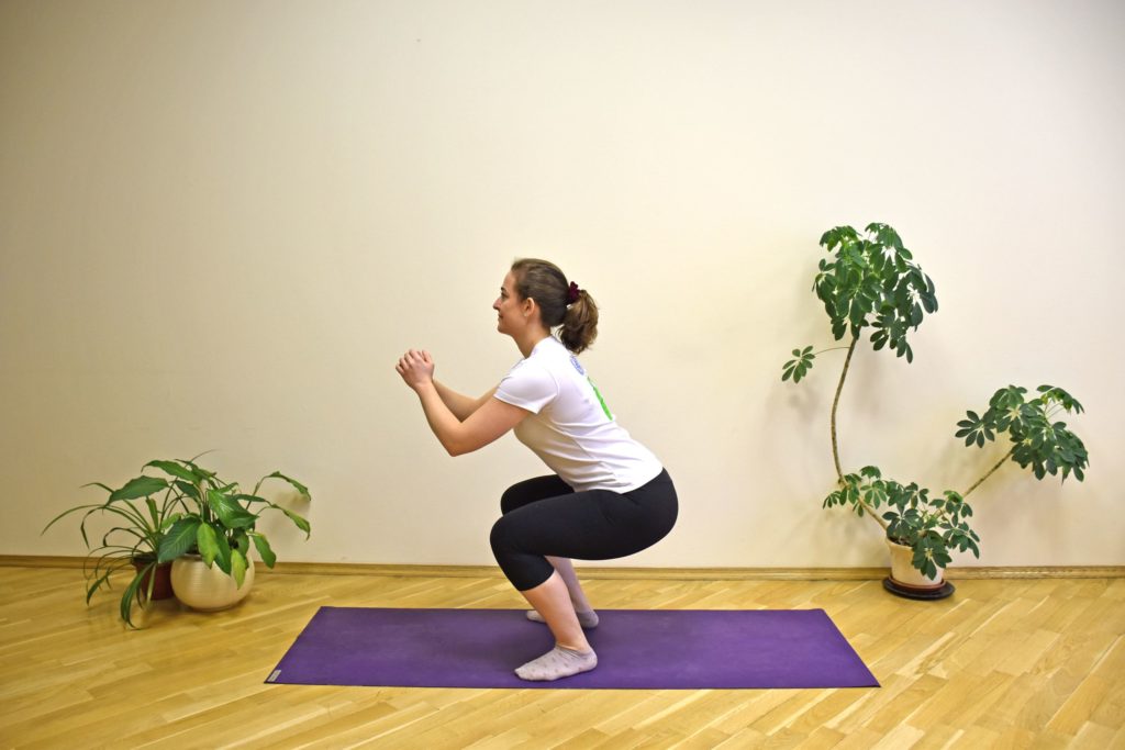 Agachamento: Coloque os pés na distância do quadril, com os dedos dos pés apontando levemente para fora. Dobre os joelhos até o ponto de seu conforto, mantendo os calcanhares no chão e os joelhos na linha (e não a frente) dos pés. Flexione e estenda os joelhos. Execute este exercício 10 a 15 vezes (ou mais), descanse por 30 a 60 segundos e repita até 5 vezes. Este exercício fortalece suas pernas e glúteos.