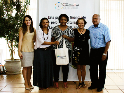 Os integrantes do SCB União recebendo a premiação com Paula Fagundes de Lima, gerente de Relações Institucionais, Comunicação e Sustentabilidade da AES Sul (E) e com Loma Pereira, presidente do Conselho Estadual de Cultura (4ª à direita)