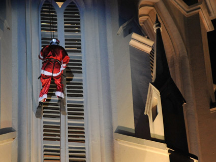Para a surpresa de crianças, jovens e adultos, o Bom Velhinho marcou presença ao descer de rapel nas torres da Catedral