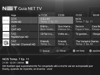 O Guia de Programação agora apresenta a programação em grade de horários (para navegar e saber tudo que está acontecendo nos diferentes canais em um determinado momento) ou em lista (para navegar em todos os programas de um determinado canal). Também estão disponíveis mais informações que facilitam encontrar o que assistir, com sinopses mais completas e o pôster do conteúdo. Usando os botões coloridos do controle remoto é possível buscar programas, filtrar os canais por gênero (como filmes, infantis, séries, esportes e variedades), além de adicionar canais à lista de favoritos, que podem ser acessados posteriormente com o botão de atalho “fav” do controle remoto.