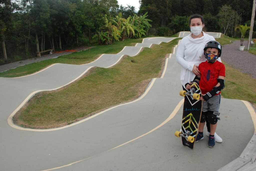 Foi buscando uma alternativa de socialização, bem-estar e desenvolvimento para o pequeno Gabriel, que Graziela de Aguiar Nunes encontrou na “The Box Skatepark” o espaço ideal. O Gabi, de apenas oito anos, é figurinha conhecida nas pistas do parque há cerca de um ano. Segundo a mãe, a iniciativa foi motivada pelas circunstâncias. “Hoje em dia eles estão sempre muito na tela do computador. Aqui ele está ao ar livre, praticando um esporte que ajuda a trabalhar o domínio do corpo, aperfeiçoar o equilíbrio e ainda possibilita diversos outros benefícios. Aqui ele tem apoio do pessoal que tem a capacitação para ele aprender com as técnicas certas, sem medo, com amparo e auxílio”, comenta Graziela.