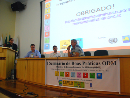 Santa Cruz do Sul foi sediou durante a última terça-feira, 25, o I Seminário de Boas Práticas – Objetivos de Desenvolvimento do Milênio (ODM). O evento, que faz parte da Jornada pelos Objetivos do Milênio no Rio Grande do Sul, aconteceu no Memorial da Universidade de Santa Cruz do Sul e reuniu gestores públicos, secretários, conselheiros municipais e lideranças que atuam nas áreas da Assistência Social (ODM 1), Educação (ODM 2), Direitos Humanos (ODM 3), Saúde (ODM 4,5,6) Meio Ambiente (ODM 7) e Desenvolvimento Econômico (ODM8).