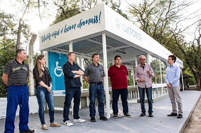 Depois de dois meses de obras, a Superparada da Oktober foi liberada para uso nesta quarta-feira. O prefeito Telmo, acompanhado dos secretários de Transportes e Serviços Urbanos, Gérson Vargas, de Obras e Infraestrutura, Leandro Kroth, de Comunicação, Régis de Oliveira Júnior, e de Planejamento, Orçamento e Gestão, Jeferson Gerhardt, visitou o espaço pronto durante a tarde. Telmo destacou que as melhorias nas principais paradas de ônibus devem dar mais conforto aos usuários. “São locais com um fluxo muito grande de pessoas. Estamos oferecendo estruturas modernas e que protegem do frio, do calor, do sol e da chuva”. O investimento na Superparada da Oktober chegou a cerca de R$ 60 mil.