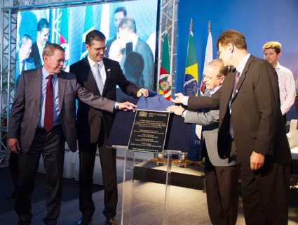 O prefeito Telmo Kirst; o presidente da Philip Morris Brasil, Amâncio Sampaio; o governador Tarso Genro e o diretor de Operações da PMB, Farley Weigel, no descerramento da placa inaugural