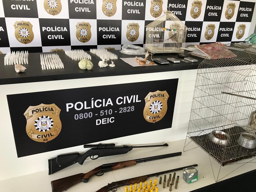 A Polícia Civil também apreendeu três aves silvestres, sendo duas caturritas e um coleirinho, cerca de um quilo de drogas, dentre 769 pinos de cocaína e mais porções de cocaína pura, merla e crack. Também foram apreendidos um revólver calibre 32, uma espingarda de pressão com luneta, uma espingarda calibre 28, uma espingarda calibre 20, munições, documentos e celulares.