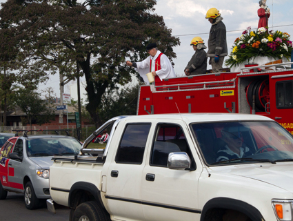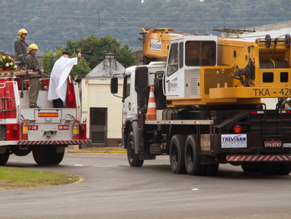 Em cima do caminhão de bombeiros, padre Zeno abençoou os veículos