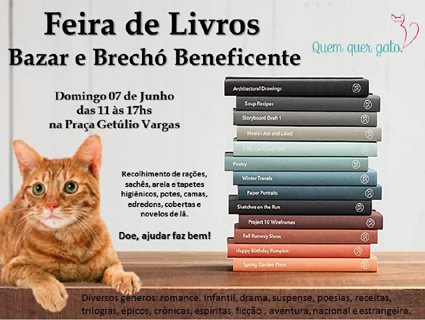 Fofura, informação, livros e roupas baratinhas. É isso que promete a primeira edição da Feira de Livros usados que o grupo de proteção de animais Quem quer Gato? está organizando para esse domingo, 7 de junho. O evento que acontecerá na Praça Getúlio Vargas, no Centro de Santa Cruz do Sul, das 11h às 15 horas, objetiva conseguir verbas para o pagamento de dívidas em clínicas veterinárias e alimentação dos animais resgatados, além de proporcionar um momento de contato com a comunidade para troca de informações e orientações sobre bem estar animal, vacinação e esterilização.