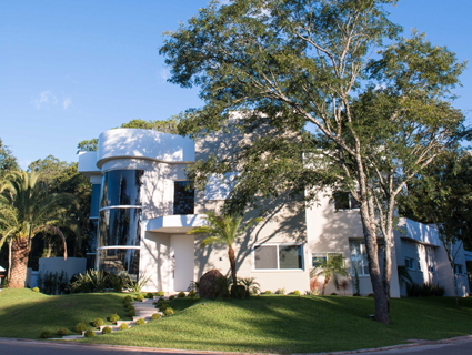 De estilo contemporâneo, a residência de 437,15 m2 se coloca sobre o lote de esquina com 1.000,00 m2 de maneira a permitir a melhor posição solar, privilegiando as fachadas mesclando linhas retas e curvas, evidenciando a área de lazer, possibilitando ainda a preservação da mata nativa existente no lote. No seu interior a utilização dos espaços amplos e integrados, juntamente com o estar de pé-direito duplo, grande lareira central e espaçoso mezanino, torna a residencia agradável em todas as ocasiões. A pedido do proprietário foi criado um estúdio musical com total tratamento térmico e acústico permitindo o seu uso sem a perturbação dos moradores e vizinhos. Também conta com terraço amplo voltado para a área de lazer e vegetação nativa do lote, permitindo o descanço e a contemplação das belezas do lugar.
