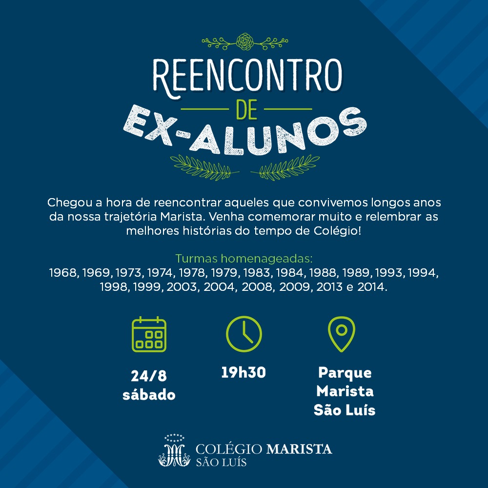 O reencontro dos ex-alunos do Colégio Marista São Luís já tem data marcada: dia 24 de agosto. Na oportunidade, acontece o jantar festivo no Parque Marista São Luís a partir das 19h30, onde as turmas que completam quinquênios vão poder se reunir para compartilhar as vivências do tempo de escola. “É importante ressaltar que, além das turmas que comemoram aniversário de formatura neste ano, todos que já foram estudantes do colégio estão convidados para o evento”, acrescenta o Diretor, Nei César Morsch. Para este Reencontro, os quinquênios homenageados são das seguintes turmas: 1968, 1969, 1973, 1974, 1978, 1979, 1983, 1984, 1988, 1989, 1993, 1994, 1998, 1999, 2003, 2004, 2008, 2009 e 2013 e 2014. Os ingressos estão sendo comercializados ao valor de R$25 na portaria do colégio.