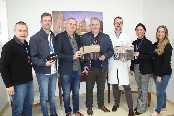 O consultor de negócios da Rio Grande Energia (RGE) no Vale do Rio Pardo, Eduardo Döring, e o vice-prefeito e secretário municipal de saúde de Santa Cruz do Sul, Elstor Desbessell, estiveram no Hospital Santa Cruz (HSC) nesta segunda-feira, dia 5, para a entrega de 500 cases para estetoscópio e 500 necessaires que serão destinados aos médicos do corpo clínico da Instituição. Os brindes fazem parte das ações de marketing institucional da empresa previstas no edital que possibilitou à casa de saúde a instalação de uma usina fotovoltaica com 466 módulos de energia solar, por meio do Programa de Eficiência Energética da Agência Nacional de Energia Elétrica (Aneel).