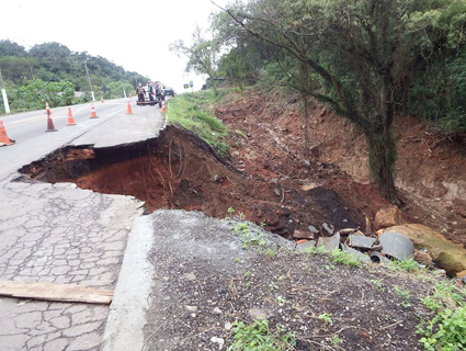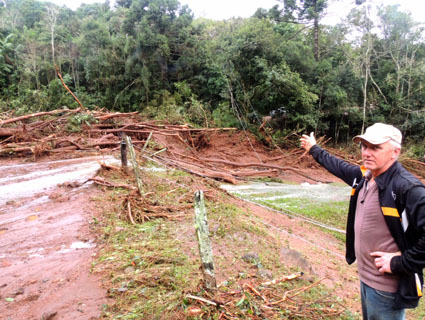 Rui Grasel mostra os estragos que o deslizamento provocou na estrada nas proximidades da estrada geral em Linha General Osório