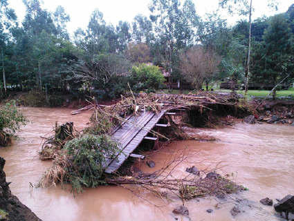 O Sítio 7 Águas, nas proximidades de Linha Andrade Neves, pela quarta vez sofre com os estragos causados pela chuva. A enchente do rio, que chegou até o Centro de Eventos, fez desmoronar barrancos e levou árvores e postes leito abaixo. Uma das cabeceiras da ponte nova cedeu e, com isso, um dos lados dela se desprendeu. A família Schmidt, proprietária do local, está bem e já reuniu esforços ainda no domingo para iniciar os reparos.