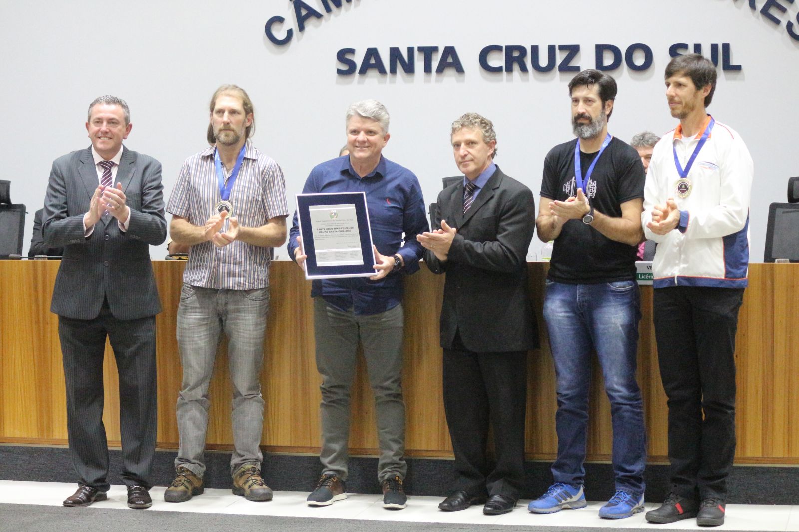 Igualmente foi concedido o título de Mérito Desportivo ao Santa Cruz Biker’s Clube – Grupo Santa Ciclismo, e aos ciclistas Giovane Faccin, Miguel Pedro Lawisch e Douglas Faccin. A prática do ciclismo é incentivada em todo o mundo por uma série de fatores: economia para os usuários; melhoria na mobilidade urbana, pois proporciona rapidez e agilidade ao trânsito; por ser mais ecológico já que não poluem o ambiente e pela saúde dos que pedalam. O ciclismo além de um esporte é um modo de vida, uma forma de conhecer lugares e se integrar com a natureza. E o Santa Cruz Biker’s Clube – Grupo Santa Ciclismo incentiva as duas modalidades, o esporte de competição e o cicloturismo.