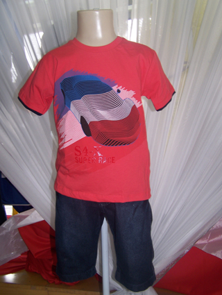 Da Malharia Milena, camiseta e bermuda jeans: opção para os meninos