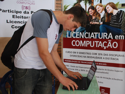 Professores e estudantes do primeiro semestre do Curso de Licenciatura em Computação da Universidade de Santa Cruz do Sul (Unisc) apresentaram na manhã dessa quarta-feira, 1º de outubro, um programa que tem utilidade para o conhecimento acadêmico e para a comunidade. Trata-se de um software que simula uma urna eletrônica. Quem passou pelo Centro de Convivência da Unisc entre 10 horas e 11h30 da manhã pode conferir o programa e experimentá-lo. Uma simulação de eleição foi feita como forma de pesquisa de intenção de votos. A atividade faz parte da comemoração dos 15 anos do curso comemorados nessa semana.