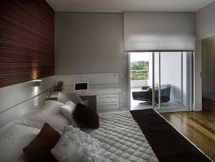 No quarto do casal, com decoração também assinada por Fábia Turchetti, a cabeceira da cama foi feita com sobreposição de rodapés lisos de 20 cm de altura. “A instalação é rápida e prática, assim como a manutenção. É possível instalar até 50 metros quadrados em apenas quatro horas”, revela Patrícia.