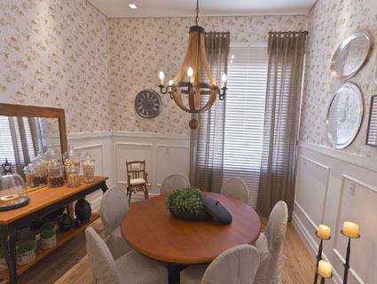 Nessa sala de almoço projetada pela decoradora Fábia Turchetti, em vez de lambri foram utilizados rodapés de poliestireno na cor branca, de 9 cm e 11 cm e placas de gesso, fornecidos e instalados pelo Ateliê Revestimentos. “A união do gesso com o rodapé criou um efeito clássico e elegante que decora ao mesmo tempo em que é funcional, pois disfarça a fiação”, comenta Patrícia.