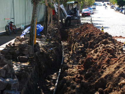 Tubulação nova é instalada no meio-fio e a antiga que está localizada no meio da rua é desativada