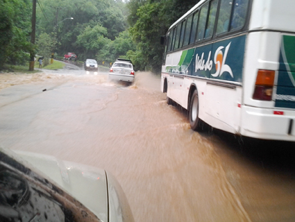 Água e lama invadiram as duas pistas do Acesso Grasel, na entrada da cidade