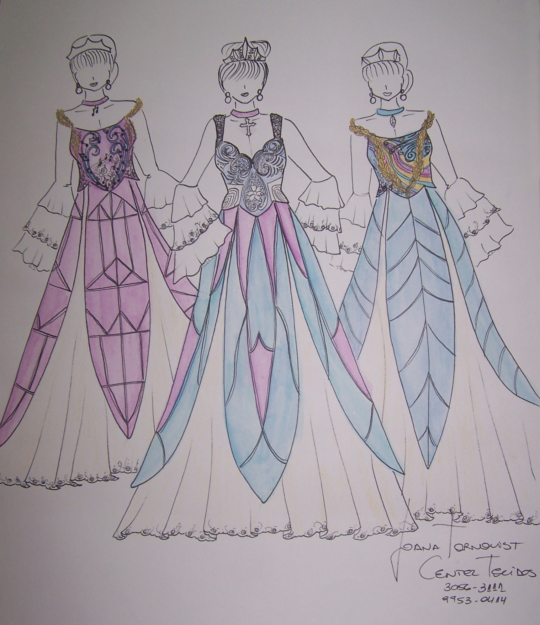 Azul, lilás, pérola e dourado dão vida ao bordado ricamente decorado com traços inspirados nos arabescos, pinturas e formas usadas nas igrejas. Vitrais, arcos ogivais, a rosáea, abóbadas e frisos emprestam formas aos cristais, vidrilhos e pérolas para ornamentar o rico corpete. A saia simboliza através da sua forma a cultura do tabaco e através de seus desenhos, a abóboda do teto com nervuras da Catedral.
