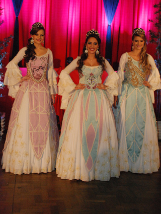Vestidos da Rainha Therry e das princesas Caroline e Andressa trazem os tons claros do interior da Catedral São João Batista