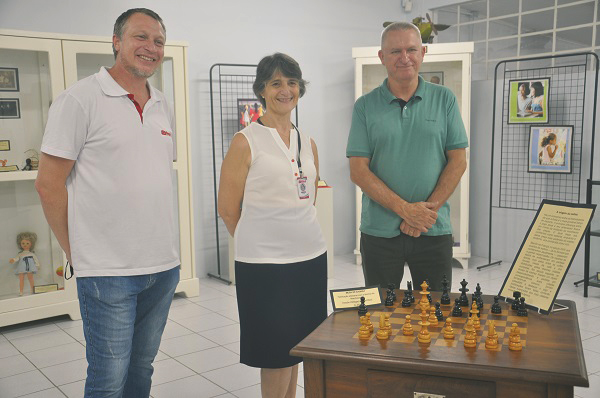 Maria Luiza Rauber Schuster e o diretor do educandário, Nestor Raschen, próximos de um brinquedo que perdura até os dias atuais, o Jogo de Xadrez