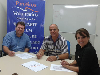 A Unidade da Organização Não-Governamental (ONG) Parceiros Voluntários (UPV) de Santa Cruz do Sul e a Associação Comunitária Pró Amparo do Menor (Copame) renovaram, na manhã desta quinta-feira, 12, a parceria entre as entidades para a prestação de serviços voluntários. A renovação é uma necessidade da nova coordenação da UPV no município, que desde o mês de março está a cargo da Associação de Entidades Empresariais de Santa Cruz do Sul (Assemp). Participaram da assinatura, o presidente da Assemp, Fábio Costa de Borba, o presidente da Copame, Roberto Gross, e a coordenadora da UPV, Alice Kwiatkowski.