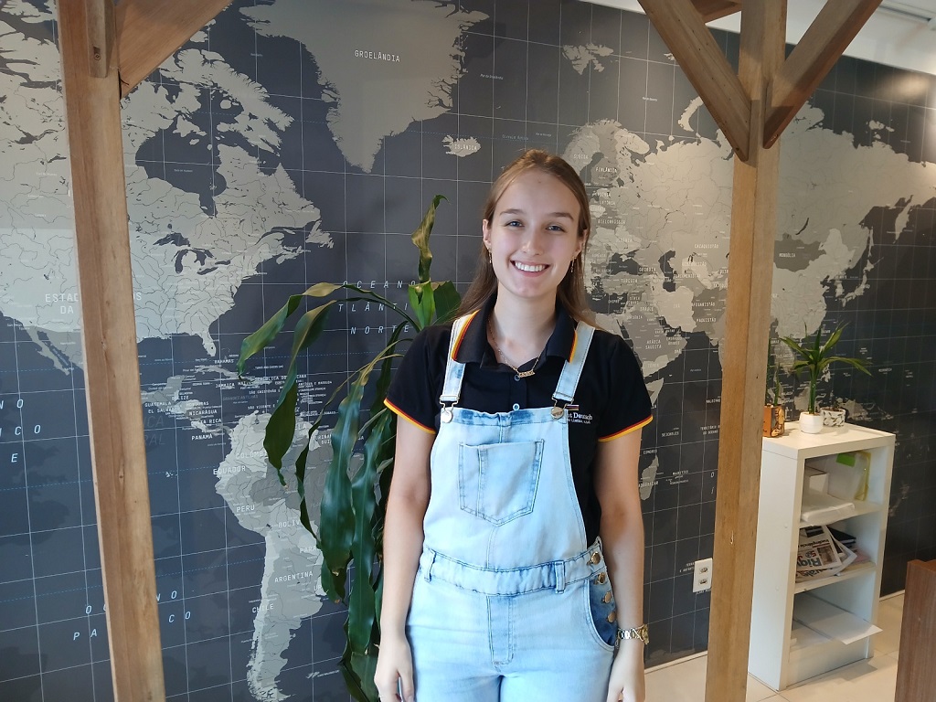 Érika estuda alemão na escola desde 2023, embora tenha tido contato com o dialeto desde a infância, falado dentro de casa. “Cheguei no colégio sem saber falar português. O alemão foi a primeira língua que aprendi”, relata. A oportunidade de intercâmbio surgiu após conquistar o certificado A1 do Instituto Goethe. “Acredito que o alemão tenha me ajudado bastante a conseguir essa vaga”, afirma.